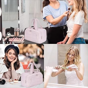 ✔️ Múltiples compartimentos y cremalleras: Incluye bolsillos con cierre, compartimentos de red y espacios elásticos para sujetar frascos y brochas.